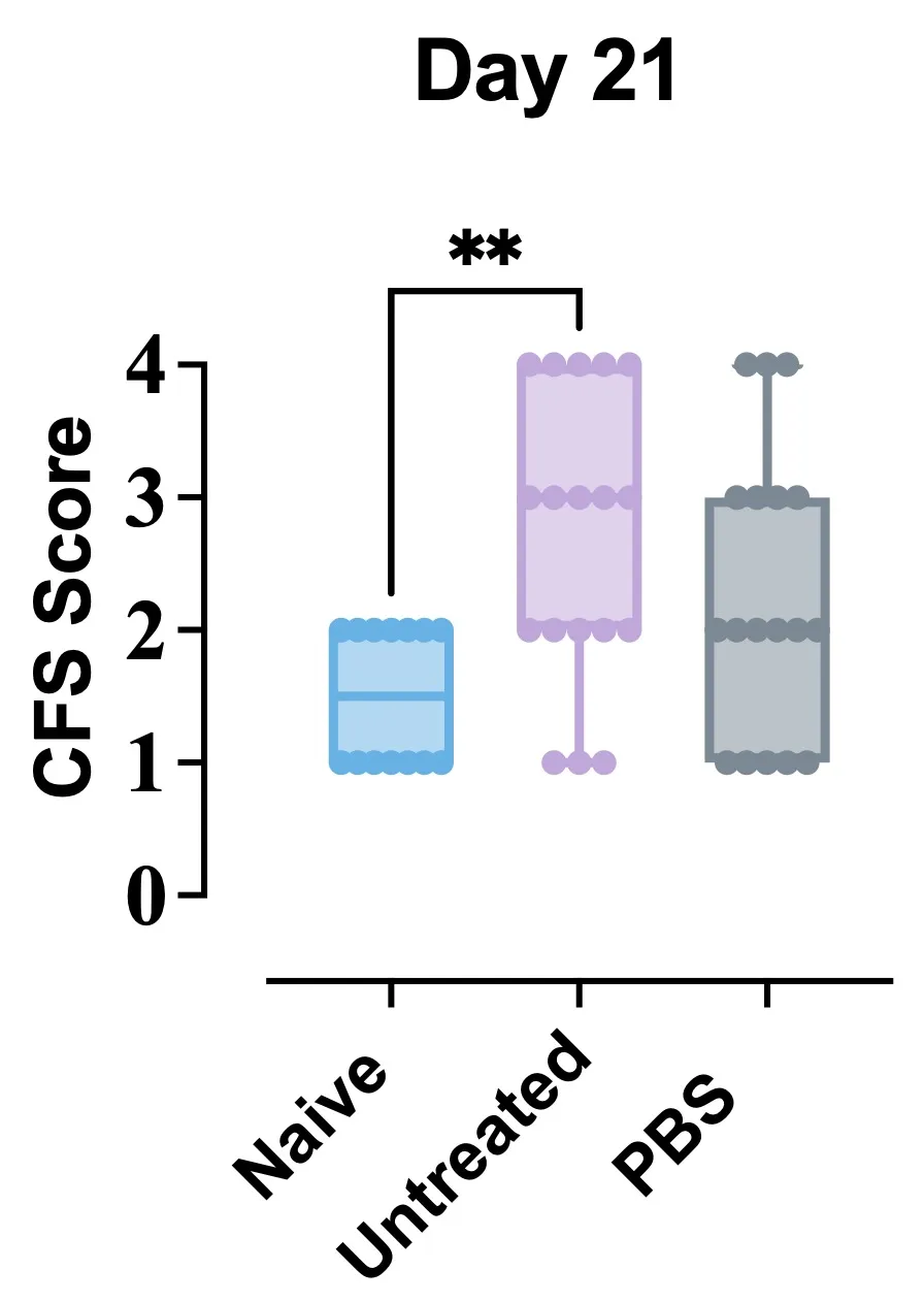 Figure 2. Corneal fluorescein score at Day 21 of the study follow-up in naïve, untreated and PBS-treated eyes.