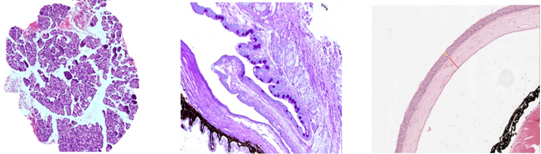 Figure 3. H&E staining of lacrimal gland, PAS staining of Goblet cells, and H&E staining of cornea.
